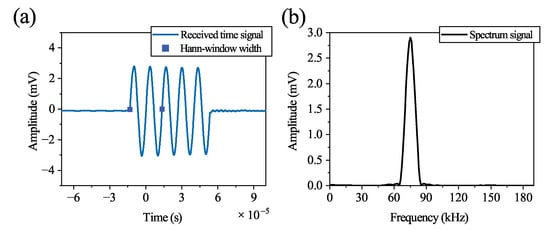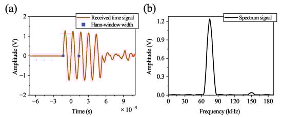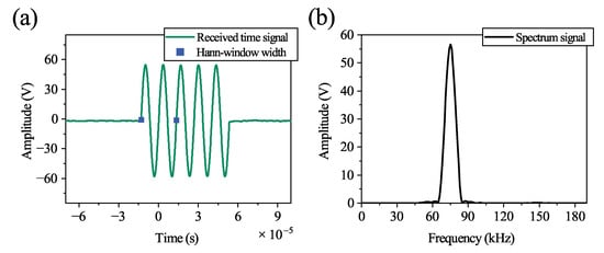 The acquired signal was transmitted to the computer for filtering, windowing, and fast Fourier transforms (FFT). Figure 3a shows the received time-domain signal (the blue marked area is the Hann window width) in carbonated concrete. It should be noted that the boundary reflected waves arrived at approximately 38 μs (the 4th cycle) and then interfered with the directly propagating wave. In order to avoid contributions from these reflected waves, the first 2 cycles of the signal were used for FFT. It was experimentally shown that the reflected waves did not affect the first 2 cycles for the concrete specimens in this paper. The frequency spectrum for the windowed signal after FFT is shown in Figure 3b. In addition, CI was used to carry out the test at excitation frequencies of 50 kHz, 75 kHz, and 100 kHz to investigate the relationship between the ultrasonic excitation frequency and the non-linear parameters of concrete carbonation.