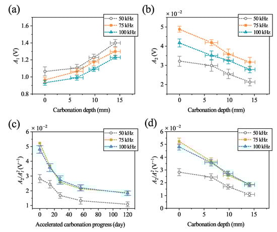 The carbonation depth was measured with phenolphthalein by averaging 10 points in spare samples after 0, 14, 28, and 120 days of carbonation. Carbonation depth here only represents the completely carbonated zone in concrete. As shown in Figure 7, the carbonation depth increases non-linearly with carbonation time. The measured carbonation depths of CI are 0.4, 9.5, 13.7, 19.2 mm, respectively. Furthermore, the measured carbonation depths of CII are 0, 6.4, 9.8, 14.1 mm, respectively. The carbonation reaction of the concrete results in an increase in the density of concrete and a change in the ultrasonic energy [21]. Figure 8 shows the variation of the fundamental amplitude and the second-harmonic amplitude of the signal. The amplitude of the fundamental wave increases significantly as carbonation depth. Whereas the non-linear parameters for the three frequencies decrease with carbonation. Research shows that the dissipation of ultrasonic energy in concrete at the same ultrasonic excitation energy increases as the frequency ranges from 50 kHz to 5 MHz [18,21,23]. The fundamental amplitudes () in Figure 8a also follow this trend. The harmonic amplitude () in Figure 8 shows an increase followed by a decrease as the frequency changes. It may be due to the influence of ultrasonic wavelength and energy attenuation on the discrimination ability for change of the concrete microstructure [21]. Correspondingly, the variation of the non-linear parameters can be observed in Figure 8c. The measured velocity of wave in concrete was 4298 m/s on average, and the second-harmonic wavelengths corresponding to excitation frequency signals of 50 kHz, 75 kHz, and 100 kHz were 42.98 mm, 28.65 mm, and 21.49 mm, respectively. When the wavelength is larger than the aggregate particle size, the energy attenuation caused by absorption and scattering is relatively small [18]. Ultrasound with higher frequencies has better directivity and lower amplitude. Whereas, low-frequency ultrasonic waves have poor directivity and high attenuation [24]. The ultrasonic amplitudes can be influenced by the ratio of the wavelength to the distance by which the propagated wave travelled [20]. As shown in Figure 8c, the non-linear parameter decreases as the increasing ratio of ultrasonic radial propagation distance to wavelength. Perhaps the radial propagation distance of the ultrasound waves limits the sensitivity of the non-linear ultrasound parameters for signals with low excitation frequency due to the length of ultrasonic propagation in this paper being 100 mm. In this paper, non-linear parameters of waves with smaller wavelengths are more effective in discriminating microscopic changes in the concrete when the transmission distance of ultrasound is greater than 2.5 times the wavelength.