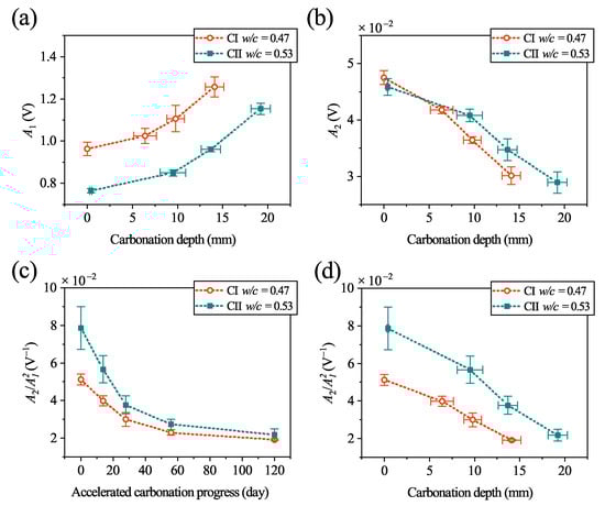 The relative non-linear parameters of the carbonated concrete were detected by exciting an incident wave at a frequency of 75 kHz, since the signal at that frequency had the largest second-harmonic amplitude as shown in Figure 8b. Figure 9 shows that the fundamental amplitude increases gradually along with carbonation depth, while the harmonic amplitude decreases. The standard deviation of the carbonation depths and the relative non-linear parameters are indicated by the error bars. Concrete with a high water–cement ratio has more porosity than concrete with a low water–cement ratio for the same volume. The fundamental amplitudes of CII are smaller than those of CI, which may be the effect of the compactness of concrete on ultrasonic attenuation. While the second-harmonic amplitudes of CII are greater than those of CI in general. It should be noted that the reflection and refraction of ultrasonic waves on the material contact interface and pore, result in scattering and attenuation of ultrasonic energy [22,25]. Whereas waveform distortion occurs at the interface and pores, resulting in the appearance and growth of harmonics [10]. During the progress of concrete carbonation, the existing pores and microcracks are deposited by the carbonation product CaCO3. The molar volume of carbonated products is higher than that of hydrates, resulting in a decrease in the porosity of concrete and an increase in the density of concrete [3,4]. Then the fundamental amplitude increases while the harmonic amplitude decreases as ultrasonic attenuation decreases.