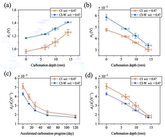 Wave velocity and characteristic impedance in water is much greater than in air. If the air in the concrete porosity is replaced by water, then a significant part of energy in the incident ultrasonic beam is no longer reflected and bypassed at the material contact interface and pore. Correspondingly, the ultrasonic wave propagates directly through the water coupling layer in the material contact interface and pore to the receiving transducer, reducing the attenuation of the ultrasonic energy to some extent [25,26]. As shown in Figure 10, the concrete specimen CI-W in conditions of saturated moisture content has a higher fundamental and second-harmonic amplitude than the dry concrete specimen CI. For the same type of concrete, as shown in Figure 10d, the change trends of non-linear parameters are all decreasing with the carbonation dapth even though their moisture contents are different. Nonlinear parameters of non-carbonated concrete in conditions of saturated moisture content measured by NRUS are also lower than those in the dry state [27]. It is interesting to note that this trend is similar as the relative non-linear longitudinal ultrasonic parameters of carbonated concrete in this study.