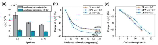 - The relative non-linear parameters for the two specimens with different water–cement ratios vary significantly during the carbonation process. In this study, CII has a higher initial relative non-linear parameter than CI . The carbonation progress of concrete can be well reflected by changes in the relative non-linear parameters. The relative non-linear parameters decrease with the carbonation depth (the completely carbonated zone).