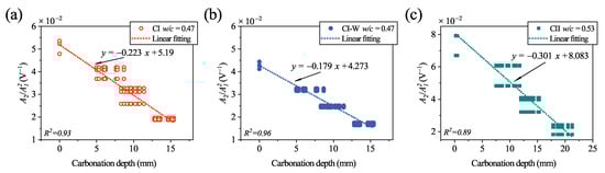As shown in Figure 11a, after 120 days of carbonation the non-linear parameters change greatly compared to those without carbonation. The relative non-linear parameters of CII are larger than that of CI . Figure 11b shows that the non-linear parameters of specimens CI, CII, and CI-W decrease by 20% and 40% on the 14th and 28th day of carbonation, since the carbonation during this 28-day period develops fast in Figure 7b. Concrete carbonation with a slow rate in the days ranging from 28th to 120th results in a decrease in the change rate of relative non-linear parameters. Ultrasonic non-linear parameters are sensitive to changes in the concrete carbonation depth. As shown in Figure 11c, the rate of variation of the relative non-linear parameters changes significantly with the carbonation depth. Meanwhile, CI and CI-W do not exhibit much difference in the variation of non-linear parameters (62.73%, 60.25%) due to the level of water content. Figure 12 shows the fitting lines between the concrete carbonation depth and the relative non-linear parameters of the ultrasonic longitudinal wave. The fitting parameters are the average relative non-linear parameters (3 samples per type of concrete) and carbonation depth (10 points per type of concrete) in the study. Subsequently, the linear equation is used in the fitting models. As shown in Figure 12, the dispersion of the relative non-linear parameters of specimens (CI-W ) is lower than that of specimens (CI ), while non-linear parameter discreteness of CII is higher than that of CI . There exists a good correlation between the carbonation depth and the relative non-linear parameters, with of 0.93, 0.96, and 0.89 for CI, CI-W, and CII, respectively. Though the non-linear parameters are relative in this study, the non-linear parameters of longitudinal waves can still be used to characterize the carbonation depth for different types of concrete.