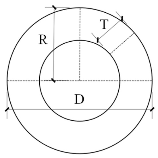 A new parameter, K, was introduced as the classification basis for ring piles. K is defined as the ratio of the wall thickness (T) of an LDRP to the pile radius (R). The specific formula is given in (1). Figure 1 shows the cross-section of a pile body, such as an LDRP. This parameter can directly represent the proportion of the hollow part of the ring pile. For a solid pile, K = 1, and the smaller the K value, the smaller the wall thickness and the larger the proportion of the hollow part.