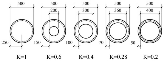 In this experiment, K was taken as the main reference and concrete savings as the secondary reference. A total of 5 groups of model pile tests were set up (as shown in Table 1). Concrete with the same specifications as the original project was selected as the material for the model pile, with an elastic modulus of E = 3.0 × 104 MPa and a reinforcement cage of uniform size. The bottom of the model pile was a 300 mm concrete seal. The pile strength measured 28 days after pouring and curing was 30 MPa. The only difference in the model piles was the difference in the hollow ranges, i.e., the difference in K. Figure 2 shows the cross-section of the pile model.