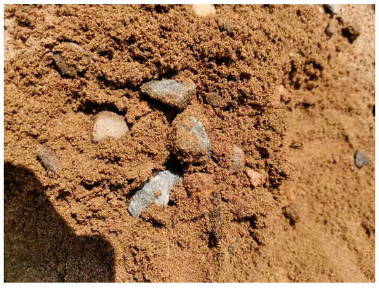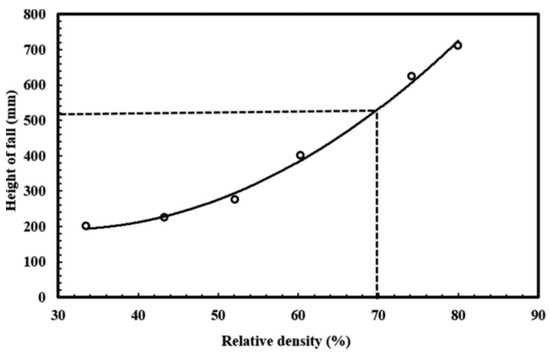 According to geological exploration data, at the original project site, within a 36 m depth range, the soil type was a gravel layer mixed with sand. Therefore, in the experiment, we used a soil layer with 10–20 mm of gravel and fine sand, mixed in the ratio of 2:3 (Figure 3). The relationship between relative density and the free fall of sand particles, as mentioned in Plaban Deb (2020) [12], is shown in Figure 4, where sand particles falling from a height of 520 mm resulted in a soil bed with a relative density of 70%. The height of the model box for this experiment was 2200 mm. First, soil was poured into the box, using the sand-pouring method. At every 200 mm in depth, the soil was compacted by using artificial vibrations. By following this procedure, soils in the model box with relative densities greater than 90% can be obtained, and the uniformity of the relative densities of the soils can be ensured.