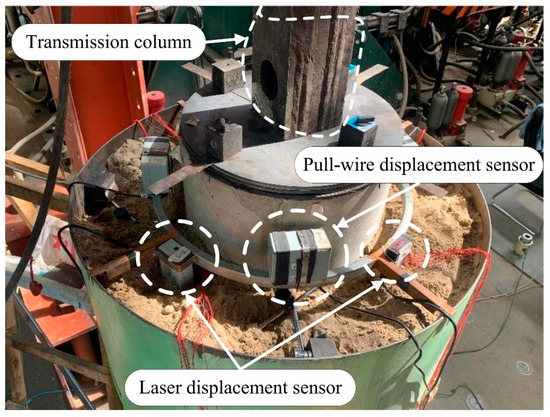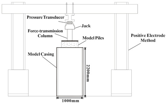 The ultimate bearing capacity of the prototype pile is 389,169 kN. According to the dimension similarity coefficient, CL = 20:1, the estimated load of the model pile is 48 kN. A 10-stage loading process was therefore designed to be applied at a rate of 20 kN/h at 10 kN per stage and maintained for 1 h until the pressure sensor monitoring data remained stable and the loading continued. The purpose of this experiment was to investigate the mechanical properties of LDRPs under vertical load. Two times the limit load can help establish the complete load–settlement curve and stress–strain relationship to reveal the laws of mechanical change in the whole process. The experimental device diagram is depicted in Figure 5, and the experimental site is shown in Figure 6. The sampling frequencies of the displacement sensor and strain sensor are 1 Hz and 0.1 Hz, respectively. The data within 10 min before the first stage of loading were taken and analyzed.