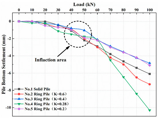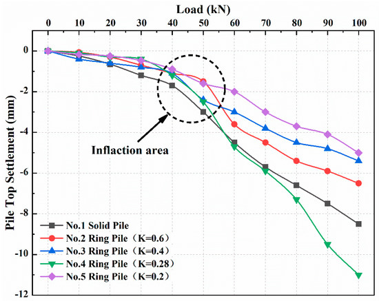 Table 4 shows the pile compression within the inflection point range. Obvious anomalies were observed in the data of Ring Pile No. 2, and these points were excluded from the analysis. Within the load range of the inflection point, the pile compression increased gradually as the value of K decreased. However, the compression remained less than 0.8 mm as the load increased to 60 kN. In addition to Ring Pile No. 4, the other four piles reached their peak displacement. As the load increased further, the pile-end bearing capacity and pile-side friction reached their maximum limits, and pile-end pierce damage occurred; the soil at the pile endpoint compressed rapidly, and stress was released to the surrounding soil. Then pile compression tended to decrease.