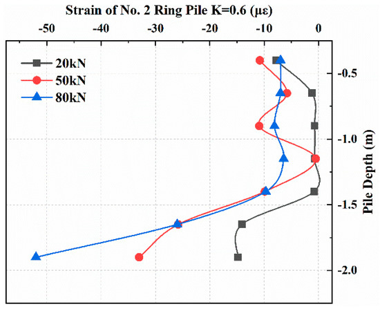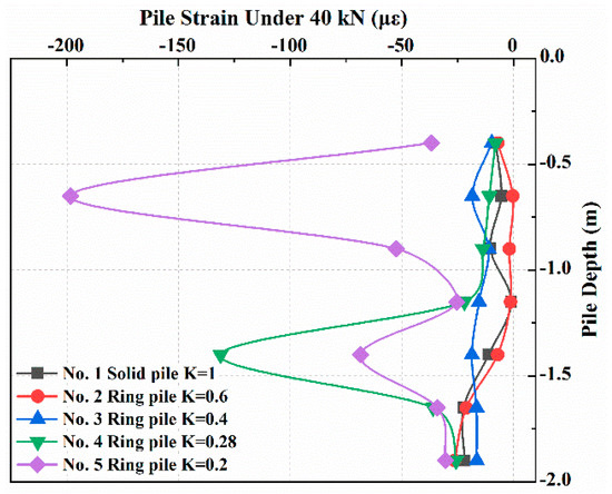 At approximately 0.75 m away from the pile top, with a variation in the value of K, strain growth showed a large variation: The change in strain growth of Ring Pile No. 2 (K = 0.6) was similar to that of the solid pile but decreased or increased slightly. The strains of Ring Pile No. 3 (K = 0.4) and Ring Pile No. 5 (K = 0.2) showed an obvious surge at this point, whereas the strain of Solid Pile No. 5 was approximately ten times that of the other piles.