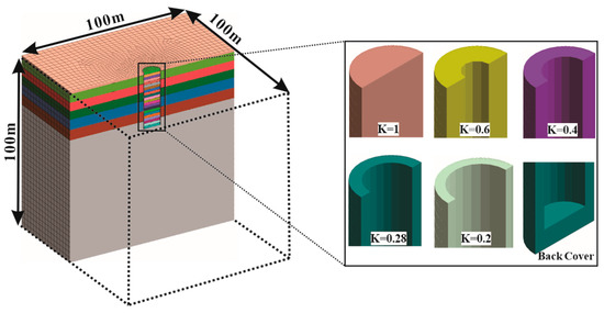 Numerical simulations were performed by using Midas GTX NX finite element numerical simulation software, according to pile diameter and pile length. To avoid the boundary effect, a soil model with 10 times the pile diameter, that is, with a size of 100 m × 100 m × 100 m, was established (Yaru Lv, 2017) [14]. According to the original engineering geological survey, the model constituted seven soil layers, and finite element calculations were carried out by using the Mohr–Coulomb soil constitutive model. Model piles are elastic constitutive models. Figure 16 shows the results of the numerical simulations conducted on the model. Except for the top surface, which was free, the remaining surfaces were not allowed to produce displacement. The material of the model piles is the same as the original project and is regarded as an elastic constitutive model. In the meshing process, using a small volume grid yields more accurate and detailed calculation results. However, refining the grid of the entire model was not necessary. Therefore, the grid sizes of the pile body and boundary were in the ratio 1:5. (Anup Sinha, 2016; Plaban Deb, 2022) [15,16].