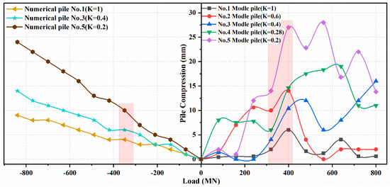 The numerical simulation experiments show the same trend as the model experiments. That is, the ultimate bearing capacity of the pile decreases with K. However, according to the provisions of the bearing capacity eigenvalues and irrespective of the numerical simulation experiments or model experiments, LDRPs with K = 0.2–1 can meet the same bearing capacity eigenvalue levels and have sufficient safety reserves.
