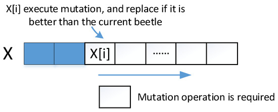 The BAS algorithm is prone to yielding values corresponding to a local extremum. In order to make the beetle escape a local extremum, the application of a mutation strategy to the beetle is proposed. In multi-dimensional problems, if each dimension changes at the same time, the following principle applies: the higher the dimension, the lower the probability that the newly generated individual is superior to the current individual. Therefore, this paper proposes a method wherein each dimension changes separately. If the beetle with the dimensional value changed is better than the one without a change, the current beetle will be updated. Otherwise, the mutation operation is continued in the next dimension—and so on—until the last dimension, as shown in Figure 1.