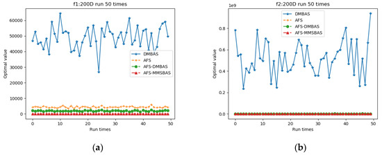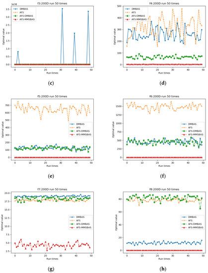 At high dimensions (D = 100, 200), the averages of the MDBAS algorithm and the AFS algorithm are far greater than the optimal value, and the standard deviation is also large, indicating that the optimization ability and stability of these two algorithms are poor. For most functions, the averages and standard deviations of the AFS-MDBAS hybrid algorithm are better than those of the separate MDBAS and AFS algorithms, which shows that the hybrid algorithm improves the optimization ability and stability of the MDBAS and AFS algorithms. The AFS-MMSBAS algorithm is an improvement of the AFS-MDBAS algorithm. Although the algorithm is not the best at optimizing the functions f7, f9, f10, and f11, it is not far behind the algorithm with the best performance. In general, the AFS-MMSBAS algorithm proposed in this paper has better optimization ability and stability with respect to high-dimensional problems.