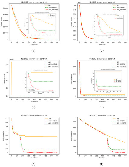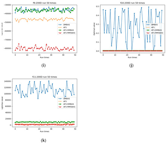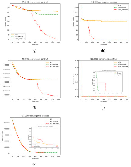 To observe the convergence of the improved BAS algorithm at high dimensions, the convergence curve of functions when D = 200 is developed, as shown in Figure 6a–k. It can be seen from the figure that the convergence curves of the three algorithms are basically coincident in the early stage. Since the AFS algorithm is used for optimization at this stage, the degree of convergence is basically the same. In the later stage, except for functions and , the convergence curve of the AFS-MMSBAS algorithm drops faster than that of the AFS-DMBAS and AFS algorithms. This shows that the improved BAS algorithm has better convergence speed than the MDBAS algorithm. In addition, the convergence curve of the AFS-MMSBAS algorithm is lower than those of the other algorithms, which also shows that the optimization ability of the algorithm is better than that of the AFS-MDBAS and AFS algorithms.
