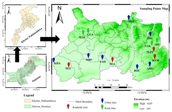 Bulk soil samples and C. procera plants were collected at 15 sites from Peshawar, Hazara, and Malakand Divisions, which were further classified into road, urban, and rural sites in Khyber Pakhtunkhwa province, Pakistan during the summer of 2019 (Figure 1). Among these three habitats, 11 sites were highly polluted at roadsides and urban areas where the heavy traffic and industries were the main sources of pollution. The roadside areas are mainly situated along the Grand trunk road from Swat to Peshawar District. Moreover, urban areas of Peshawar and Hazara Divisions are the industrial areas, which are densely polluted [34]. However, the rural areas from Malakand Division are characterized by low traffic intensity and population, which is considered as a control site. In Peshawar (34°02′ and 71°56′), elevation is 372 m asl, where the highest temperature was recorded to be 42.7 °C in June, and the lowest temperature was 15.5 °C in January. The relative humidity ranges from 37% to 70% throughout the year.