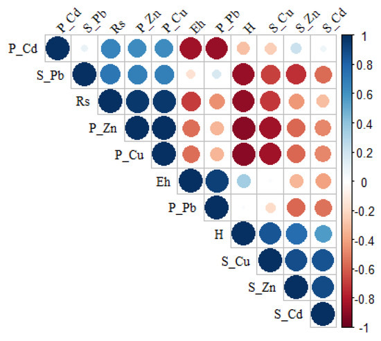 Correlation plot showing association between species diversity indices and HMs accumulation in soil and plants of the study area. Note: The colour represents the degree of pairwise correlation with regards to the Pearson correlation coefficient, P (plant): S (soil).