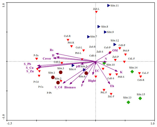 PCA-biplot of 15 contaminated sites superimposed with the corresponding influencing factors.