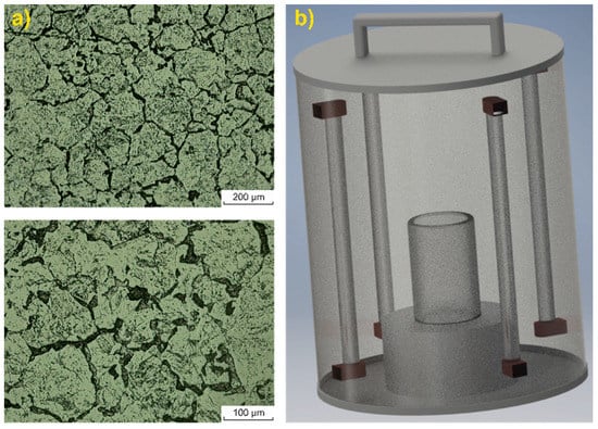 (a): Optical microscopy of the austenitic stainless-steel surface; (b): principle scheme of the photoreactor.