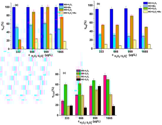 When mineralization comes into discussion, hydrogen peroxide presents the highest photodegradation efficiency for MB (74.5% vs. 69.9% for persulfate, at 1666 μg/L, Figure 2c), while for MO, persulfate is more efficient at 999 μg/L (57%, Figure 2c).