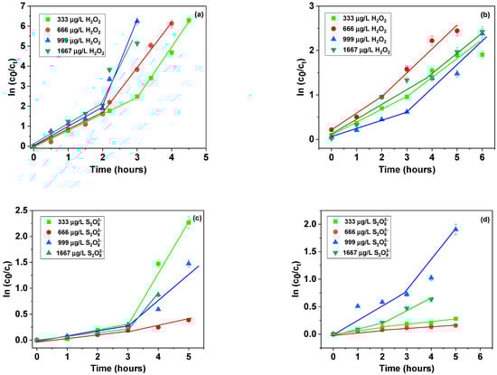 Pseudo-first order kinetic of photodegradation for (a): MB in the presence of H2O2; (b): MO in the presence of H2O2; (c): MB in the presence of S2O82−; (d): MO in the presence of S2O82−.