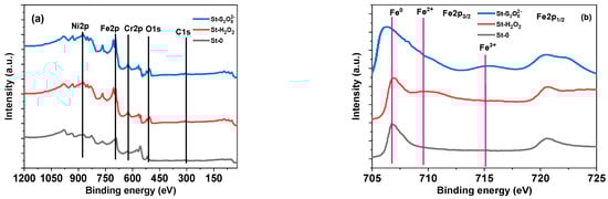 (a): Survey XPS spectra of stainless steel (St-0), stainless steel immersed in hydrogen peroxide (St-H2O2), and stainless steel immersed in potassium persulfate (St-S2O82−); (b): high-resolution XPS Fe2p envelopes.