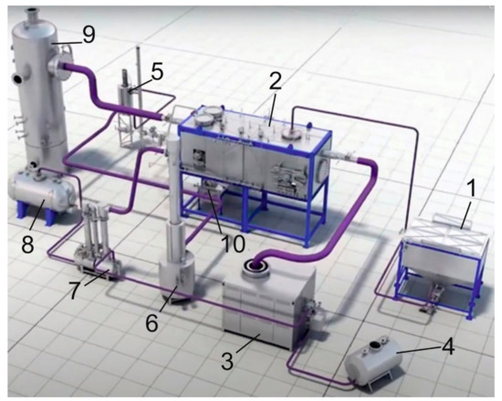 Setup for steam pyrolysis of OS: 1—loading unit, 2—reactor, 3—steam boiler, 4—fuel storage tank, 5—emergency combustion system, 6—stage I of steam–gas product condensation, 7—stage II of steam–gas product condensation, 8—accumulator of condensed products (water), 9—scrubber, 10—discharging loader for solid-phase products.
