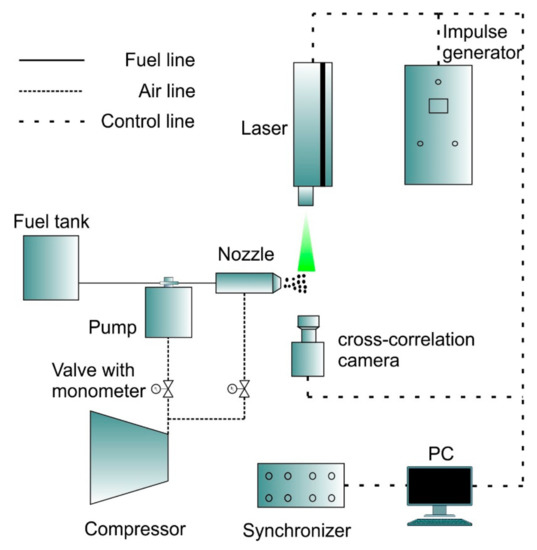 Liquid hydrocarbons were supplied from the fuel tank using an air-operated diaphragm pump. The spraying agent was air supplied by the compressor to a pneumatic nozzle with internal mixing chamber (Figure 4). The jet of sprayed products was illuminated with a laser sheet.