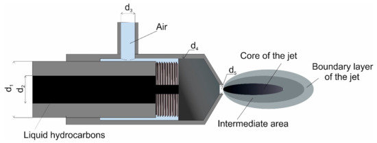 The device for spraying liquid hydrocarbons used in the experiments is typical in design. The nozzle can be used to spray liquids with different properties (viscosity, density, etc.) with or without the spraying agent (air).