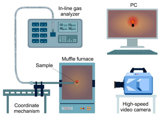 The main component of the experimental setup (Figure 5) is a temperature-controlled furnace (Rusuniversal, Russia) used as combustion chamber, supplied with a digital temperature controller (measurement error ± 1–3 °C) 0.012 m3 in volume. The setup also includes Fastcam SA4 high-speed cam-coder (Photron, USA) with a 1024 × 1024-pixel (20 µm pixel size) image format, 12-bit color depth, and 500 frames per second shooting frequency, and the platform of the coordinate mechanism was designed to feed liquid fuel droplets into the furnace with less than 1 mm movement error. Analysis of the gas-phase products was performed by once-through gas analyzer Test-1 (BONER, Russia).