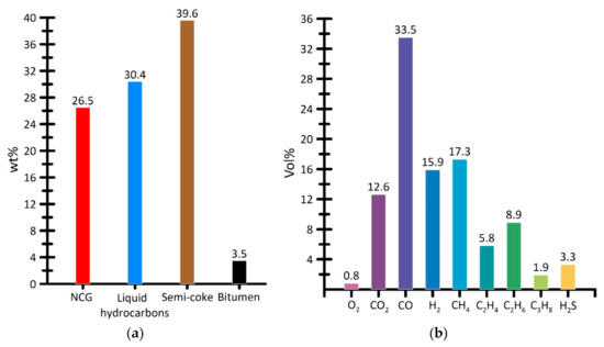 Figure 6 presents the average values of the mass ratio of the products yielded by the steam pyrolysis of OS in the form of semi-coke, liquid hydrocarbons, and non-condensable gas-phase products. The figure also shows the composition of non-condensable gas-phase products of steam pyrolysis.