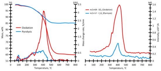 The MS analysis data show that during oxidation of the semi-coke sample, SO2 releases with the profile that can be determined in the temperature range of 294–497 °C. The profile of CO2 release, the main product of oxidation of combustible matter, is in fact a mirror image of the corresponding DTG profile.