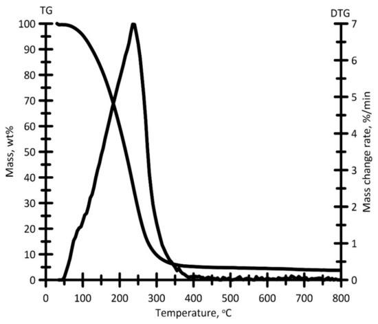 Generally, oxidation of the sample can be divided into two stages. The first one is removal of residual volatile compounds (up to 365 °C). The second one is subsequent oxidation of the carbon residue. Moreover, the monomodal DTG profile has an additional shoulder in the temperature range of 248–365 °C. The maximum reaction rate wmax is 3.1 wt%/min at Tmax = 462 °C.