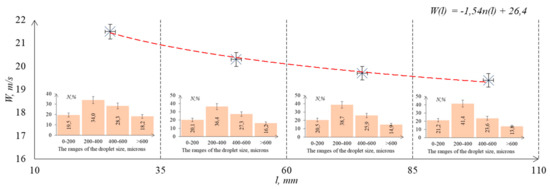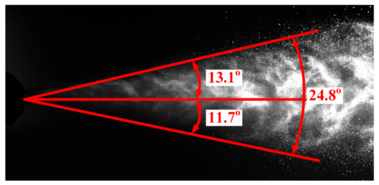 High-speed visualization of jet characteristics (droplet velocities and spraying angle) and image processing were performed according to [26]. Image processing was performed using the ActualFlow software developed by Sigma-Pro (Novosibirsk, Russia) [27]. At the moment of the study area illumination with a laser pulse, the jet was recorded using a digital cross-correlation camera. The camera was installed perpendicular to the laser sheet plane. Figure 3 presents a schematic diagram of the experimental setup for recording a liquid hydrocarbon droplet jet after pneumatic spraying.