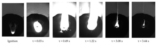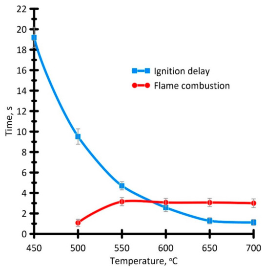 Several parameters were analyzed for comparative assessment of the droplet ignition and combustion characteristics at different air temperatures. They are ignition delay time, flame combustion time, and total combustion time recorded by a high-speed camcorder. The ignition delay time was considered the time from the moment the holder with a liquid hydrocarbon droplet entered the chamber focus until the start of the visible surface glowing, which corresponded to the start of combustion. The flame combustion time was recorded starting from the moment of visible glowing until flame failure. The total combustion time was determined by the interval from the moment of visible glowing to complete attenuation of the resulting carbon residue.