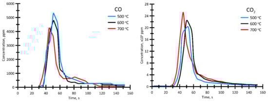 The resulting steam (with a temperature of 650 °C and a flow rate of 150 kg/h) was supplied to reactor (2) as an agent, which initiated the OS steam pyrolysis. The OS heating rate was about 50 °C/min, which corresponds to the slow pyrolysis process. The maximum temperature of the OS sample was about 620 °C. The pyrolysis process can be generally divided into two stages: evaporation of external moisture and hydrocarbons with a low boiling point and thermal decomposition of high-molecular compounds with the formation of gaseous products. Based on the OS heating rate and the maximum attainable temperature inside the sample, the time of the active pyrolysis process (the second stage) proceeded on average for 45 min.