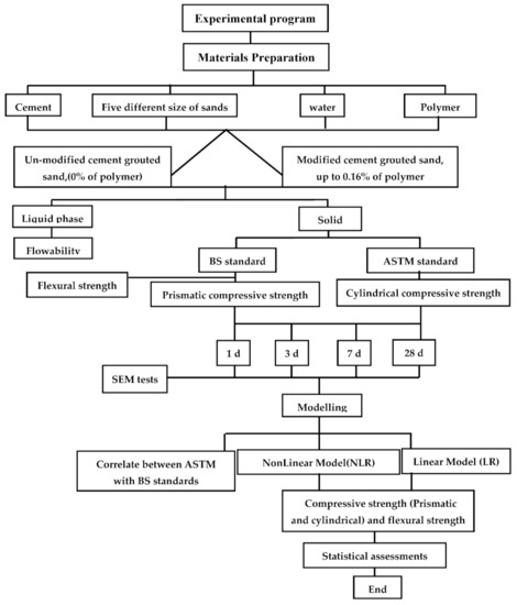 Grouting is a technique for sealing fissures in the rock, concrete, and masonry structures. Several studies have used a wide range of grout materials, including cement substituted by a silica fume (SF), metakaolin (MK), and fly ash (FA), as well as cement treated with polymers [1,2,3,4]. The main purpose of the grouting process is to cover the sand particles with a high flowable grout material. The component’s compressive and bonding strengths will be greatly improved as a result [5]. Water reducer polymers are widely used in the cement grout (CG), cementitious materials (CM), and concrete industries to reduce the content of water and improve the physical and structural properties of cement [6,7,8].