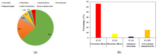 Brushite and cassiterite characteristic peaks at 25° are visible at 2θ = 19° and 23.15° for the water reducer polymer (Figure 2a). The main composition of the cement is shown in Figure 2b. Figure 3 depicts the percentage of the cement composition used in this study.