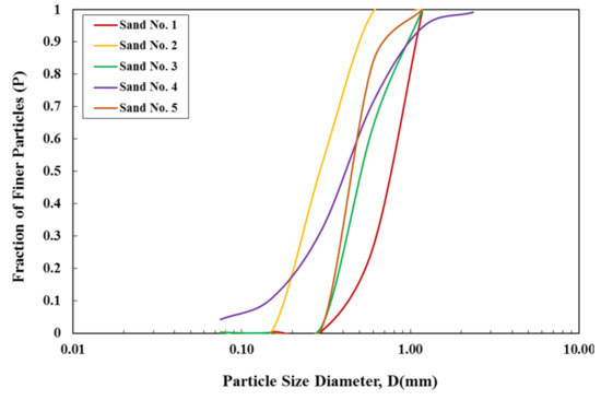In this research, five sand with different grading were used. Figure 4 shows the particle size distribution (PSD) and specific gravity (Gs) of the sands utilized, which are also shown in Table 1.