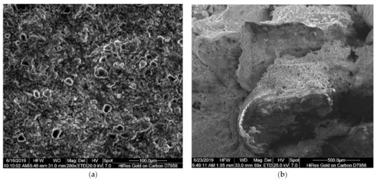 The particles of the water reducer polymer and the cement sand particles are attracted to each other. Figure 6 shows SEM observations of CG modified with water reducer polymer. The particles were not well-positioned in the matrix after 7 days of testing, as shown in Figure 6a. The microstructure of CG modified by water reducer polymer showed that the polymer creates an ephemeral silicone that fills the space between cement and sand particles after one week of curing; thus, the CS of the CG will be increased (Figure 6b).