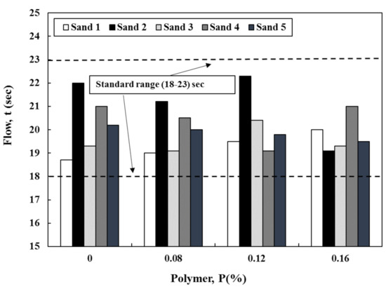 The flow of self-compacting cement grouts is a primary design function [6]. Adding water-reducing polymer reduced required water content while maintaining flowability in the 21 ± 2 s range (Figure 7). Adding water-reducing polymer reduced the water content of CG by 20% to 54% to achieve the desired flowability based on the mix proportions, as shown in Figure 7. Adding 0.12% of water reducer polymer reduced the w/c of CG by 23% to 50%, depending on the mix proportions.