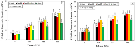 Typical variation of prismatic CS of CG modified with water reducer polymer-polymer at (a) one d and (b) 28 d of curing.