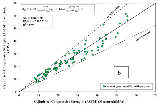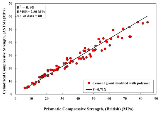 Depending on the 80 tested data, the ratio of the of cement grout using a cylinder mold to the was 0.71 with R2 of 0.95 and RMSE of 2.8 MPa (Figure 12).