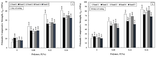 , and = prismatic, cylindrical compression strength and flexural strength of compressive strength (MPa). P = polymer content (%).