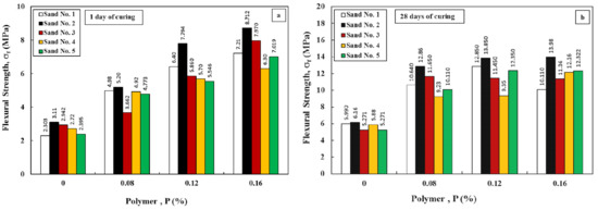 Figure 13 shows a typical flexural strength for a CG modified with water reducer polymer. Adding polymer to CG increases its flexural strength and its CS. Compared to the other sands, the cement grout made with finer sand grading (Sand #2) had the maximum σf at all testing ages.