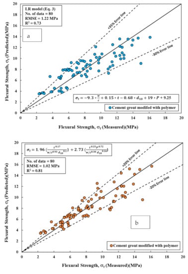 The LR model parameters (Equation (12)) and NLR model parameters (Equation (13)) concluded that increasing the polymer content (P%) significantly raises the σf of cement grout (Figure 14a,b).