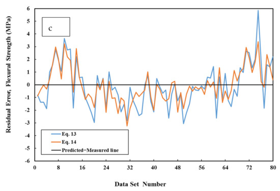 Measured and predicted relationship for the flexural strength of CG (a) LR model, (b) NLR model, and (c) residual error.