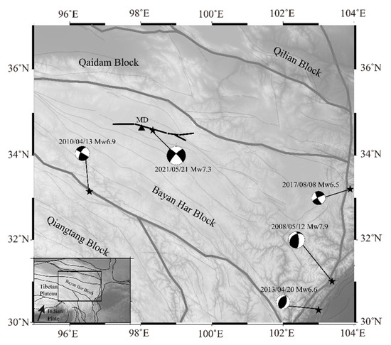 - Zhan, Y.; Liang, M.; Sun, X.; Huang, F.; Zhao, L.; Gong, Y.; Han, J.; Li, C.; Zhang, P.; Zhang, H. Deep structure and seismogenic pattern of the 2021.5.22 Madoi (Qinghai) MS7.4 earthquake. Chin. J. Geophys. 2021, 64, 2232–2252. [Google Scholar]