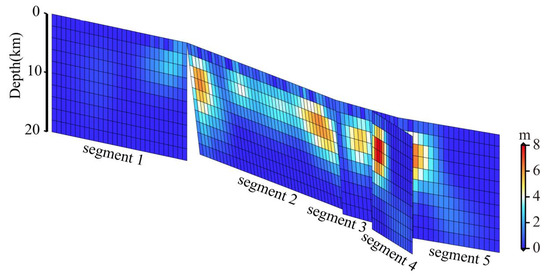 Zhao et al. determined the slip distribution of the coseismic rupture of Maduo earthquake based on InSAR data (Figure 2) [32]. Their results show that the length of surface rupture is about 160 km distributed on five sub-vertical segments with strikes of 89.5°, 106°, 97.6°, 117.5°, and 83° and dips of 90°, 75°, 80°, 90°, and 90°, respectively. The faulting style is primarily left-lateral. The maximum strike slip and total slip (the sum of strike slip and dip slip) are about 6 m and 8 m at 6 km depth on segment 4, respectively. Most of them are released in the upper crust (0–15 km). There are three areas with significant coseismic slip (larger than 5 m), two areas in segment 2, and the other one is near the triple junction zone between segment 3, segment 4, and segment 5 (Figure 2).