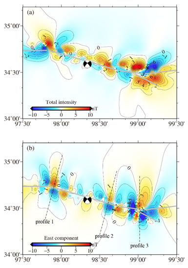 Contours of calculated (a) total intensity and (b) east component of PMs obtained from the Maduo earthquake. Contour interval is 1 nT. Focal spheres represent the epicenter. Gray lines are the surface rupture. Dash lines are profiles.