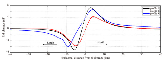 In order to eliminate the distortion of PMs resulting from stress concentration and singularity on the fault plane, we do not consider the PMs in the project area of fault slip about 2 km from the fault trace. The PMs are calculated at 1 m, where magnetometers are usually installed. The total intensity (F) and east component (Y) of PMs are calculated because Y is expected to be significantly changed under the east–west slip regime.