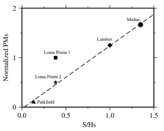 Normalized PMs of four earthquakes. Square and star are NPMs of Loma Prieta earthquake with stress sensitivity of 1 × 10−3 Mpa−1 and 2 × 10−3 Mpa−1. Dashed line is a fitting line of NPMs versus S/Hs for the four earthquakes.